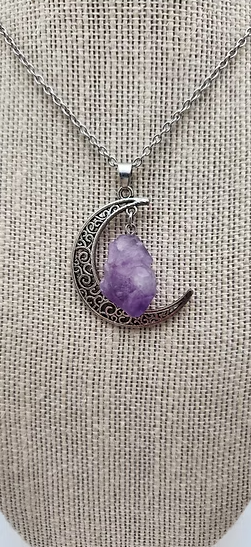 This crescent moon necklace paired with an earthy raw Amethyst stone. Moon pendant is antique silver finish. Because this is a natural stone, it will vary in size, shape, and color.